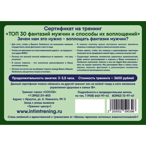 Подарочный сертификат на тренинг "Топ 30 сексуальных фантазий мужчины" 4500 рублей