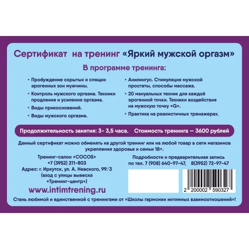 Подарочный сертификат на тренинг "Яркий мужской оргазм" 4500 рублей
