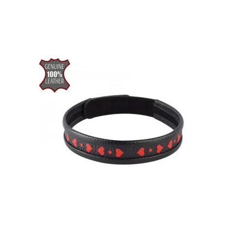 Изысканный ошейник, привнесёт в ролевые игры нотку романтизма, и обязательно привлечёт внимание к Вашей шее. Черный ошейник из натуральной кожи, с красными вставками в виде сердечек. На ошейнике имеется несколько кнопок, которые позволяют подогнать его под необходимый размер. Ширина ошейника 21 мм, длина 41 см, масса нетто 20 гр. Цвет черный.