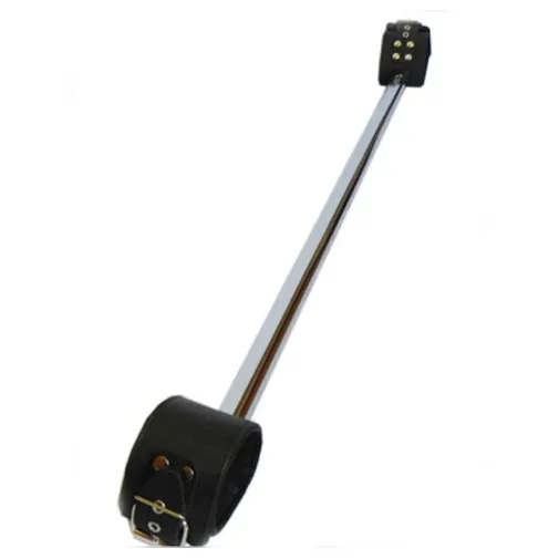 Этот БДСМ комплект — распорка для ног изготовлен из натуральной кожи чёрного цвета и металлической штанги. Данный бондаж надёжно фиксирует ноги на ширине плеч. Размер поножей регулируется при помощи ремешков. Максимальный размер поножей — 31 см, минимальный — 23 см. Длина штанги — 80 см.
