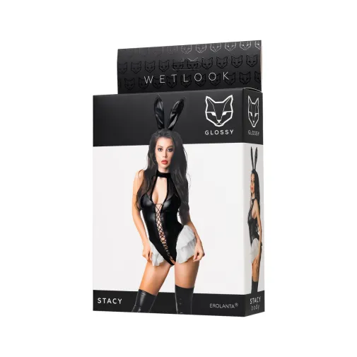 Подчеркните свою игривость и сексуальность с комплектом Stacy, представляющим собой зажигательное боди с объемным хвостиком и ушками зайчика. Этот образ выполнен из черного блестящего материала Wetlook, сетки и акцентных белых атласных воланов. Материал, словно вторая кожа, облегает тело, подчеркивая его интимные детали, создавая неповторимый и провокационный образ.
