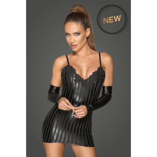 Освободите своего внутреннего бунтаря с этим соблазнительным мини-платьем, выполненным из полосатой эко кожи с декоративной вышивкой. Платье имеет регулируемые бретели и виниловую молнию на спине.