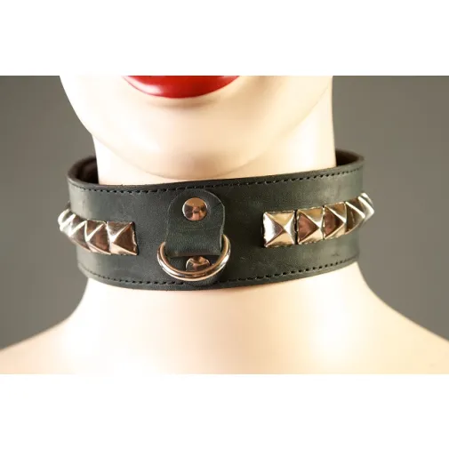 Узкий ошейник фирмы "Подиум СПб" выполнен из натуральной кожи и декорирован пуклями пирамидальной формы, вплотную прилегающими друг к другу. Впереди имеется D - образное кольцо для использования различных бондажных систем. Подкладка из замши предотвращает натирание кожи. Размер ошейника регулируется при помощи замка - пряжки.