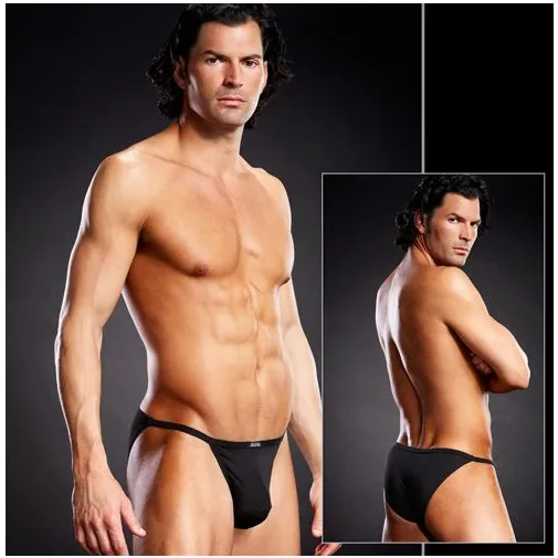 Стринг-бикини - это мужские трусы из треугольников материала спереди и сзади, соединенные тонкими полосками. Мужская попа аппетитно прикрывается материалом черного цвета.