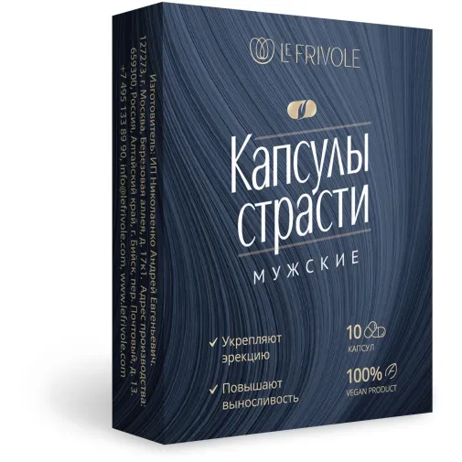 Мужские капсулы страсти – это возбуждающее средство в удобном формате и с натуральным составом, созданные на территории Алтайского края. Капсулы предназначены для укрепления эрекции, повышения сексуальной выносливости и полового влечения.