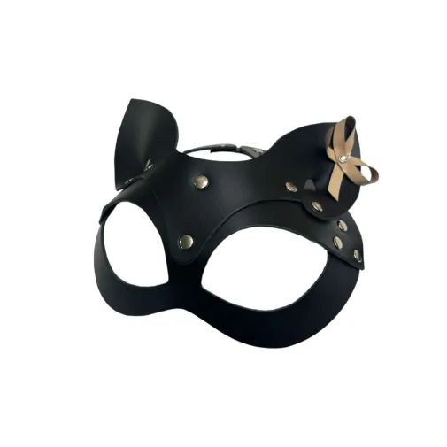Маска кошки с игривым бантиком - аксессуар, который понравится ценителям утонченных и необычных моделей. Выполнена маска из натуральной кожи черного цвета, удобно фиксируется с помощью пряжки, легко регулируется по размеру. На одном ушке расположен небольшой бантик из лаковой бежевой кожи со стразом в центре, что придает аксессуару особый шарм. Маска прекрасно держит форму благодаря плотной качественной коже. Идеально подходит под любую форму головы, подчёркивая глаза. Эта маска поможет Вам создать яркий, игривый образ страстной кошечки.
