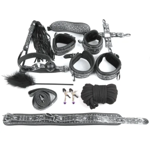 Великолепный набор аксессуаров для любителей БДСМ. В комплект входят наручники, оковы, ошейник с поводком, веревка, фиксатор, плетка, кляп, маска, зажимы для сосков, щекоталка.