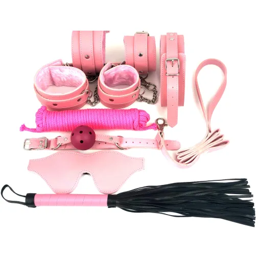 В набор входит абсолютно все, что может пригодиться для самой шикарной ночи в стиле БДСМ — наручники, оковы, кляп, плеть, закрытая маска на глаза, веревка для шибари, и даже ошейник с поводком!
