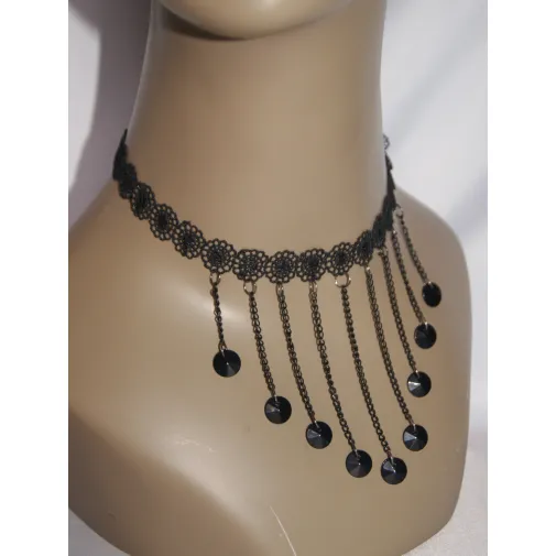 ЧОКЕР ЧЕРНЫЙ КРУЖЕВНОЙ С ЧЕРНЫМИ КАМНЯМИ НА ЦЕПОЧКАХ