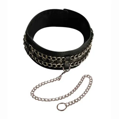 Изготовлен из натуральной кожи с велюровой подкладой. При изготовлении использована никелированная фурнитура. Ширина ошейника 20 мм, длина шипов 12 мм. Размер универсальный, регулируется при помощи кнопок. Один из основных атрибутов BDSM.
