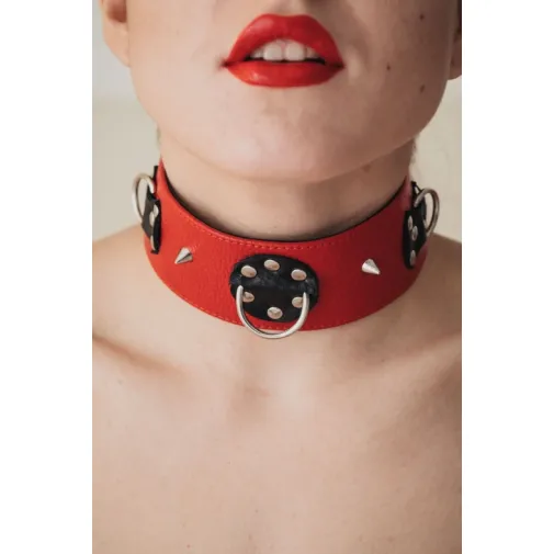 Ошейник выполнен из натуральной кожи красного цвета, декорирован шипами, вставками из черной кожи. На изделии находятся три сварных полукольца, ширина ошейника 5см.Аксессуар декорирован металлическими заклепками. Ошейник фиксируется металлическими кнопками, позволяющими подобрать нужный размер,подойдет на обхват от 32 до 37см.Стильный аксессуар поможет воплотить эротические фантазии в реальность.
