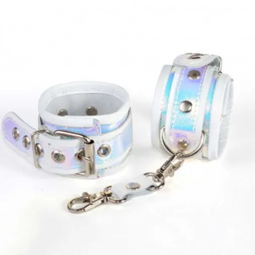 Наручники из белой натуральной кожи от Sitabella с декором из перламутрового материала. Они в первую очередь понравятся женщинам, которые любят изящный дизайн. Переливающиеся вставки расположены по краям, а также по центру. Вся фурнитура сделана из металла, как и клепки, которыми продублированы все соединения. Наручники сцепляются между собой при помощи короткой кожаной перемычки с карабинами на концах. Для регулировки по размеру и фиксации на запястьях служат обычные пряжки со штырьком. Это одна из лучших моделей для БДСМ-игр в коллекции. Длина браслетов 23 см., ширина 5,3 см. длина сцепки 9,5 см.