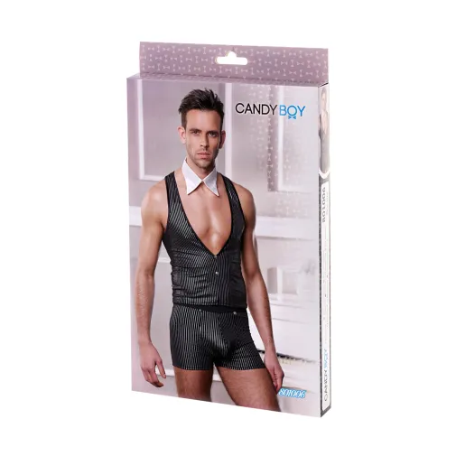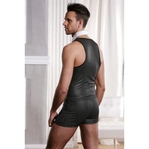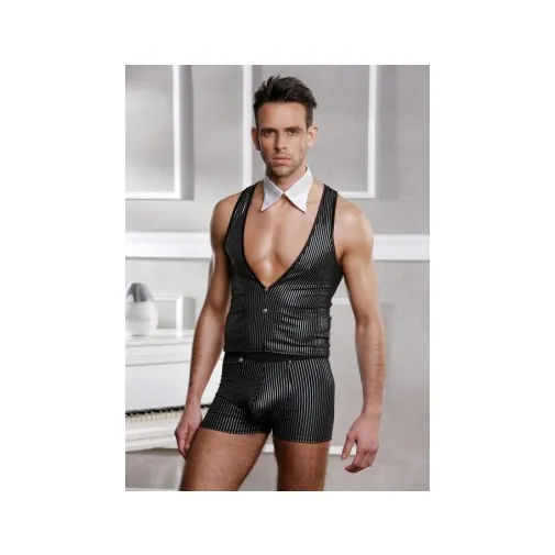 Этот элегантный ролевой костюм подчеркнёт природное обаяние мужчины, которое покоряет с первого взгляда. Ведь эластичная жилетка, трусы-шорты, украшенные серебристыми пуговицами, и воротник-галстук помогают создать не просто образ, а образ джентльмена, знающего толк в сексе высокого стиля.