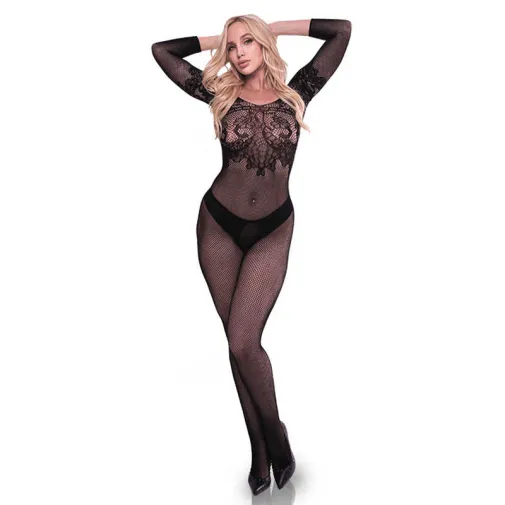 Полный боди-комбинезон с рукавами на три четверти. Модель сделана из мелкоячеистой ткани-сеточки и украшена красивыми узорами. Ажурная вышивка находится в нижней части спины, на плечах и акцентирует область бюста, Верх спины оставлен открытым. В промежности находится вырез, открывающий интимную зону для ласк и проникновения. Высококачественный материал хорошо растягивается, красиво облегает фигуру, прекрасно держит форму. Сеточка не деформируется при стирке и сохраняет свойства на протяжении длительного времени. Состав 94% нейлон, 6% спандекс. Размер S/L.
