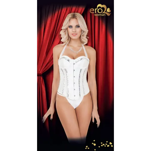 Набор из двух предметов: корсет и трусики. Сатиновый корсет на косточках украшен блестками. Цвет: Белый. Размер: XL
