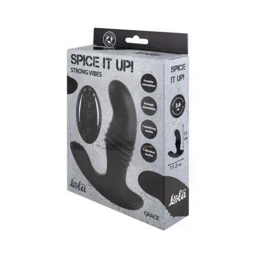 Spice it Up Grace - это водонепроницаемый силиконовый массажер простаты с удобным дистанционным пультом управления. Игрушка имеет два вибромотора - в верхней части и в зоне для стимуляции промежности. Каждый мотор оснащен 7 режимами. Также массажер может пульсировать, растягиваясь и сжимаясь с разной частотой, воплощая 7 различных паттернов. Анатомически выверенная проникающая часть с загнутым кончиком, вкупе с ее размерами, гарантированно достанет до простаты, усиливая потенцию и делая эякуляцию ярче. Массажер заряжается магнитным зарядным устройством, пульт ДУ работает на расстоянии до 15 метров.