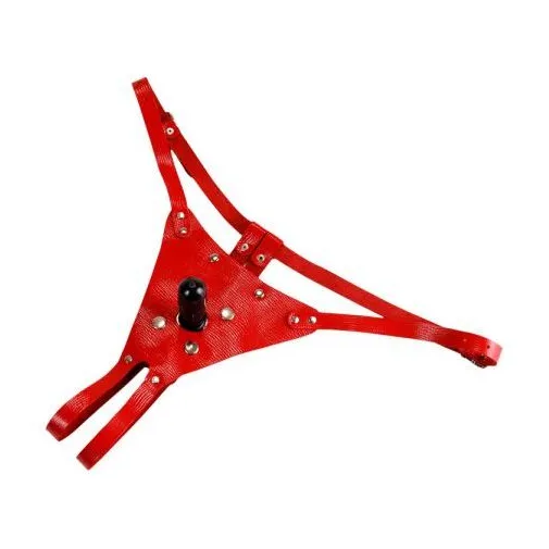 Трусики. Изготовлены из натуральной кожи. При производстве используется никелированная фурнитура. Размер регулируется ремешками, которые крепятся на бёдрах (от 42 до 50 размера). В комплект входит съёмный пластиковый плаг для насадок (длина 68 мм). Идеально подходит для использования, как мужчиной, так и женщиной.