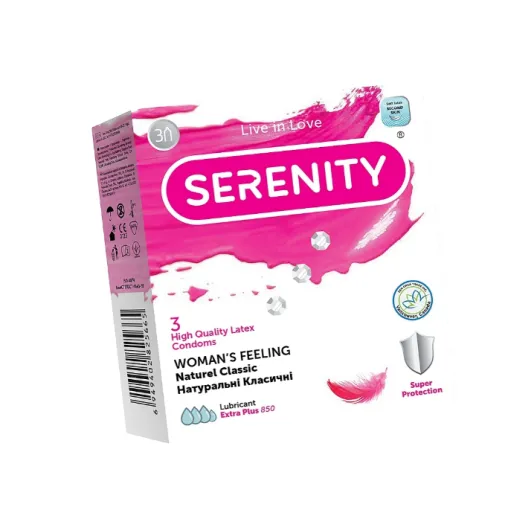 Serenity WOMAN’S FEELING Naturel Classic. Очень увлажненные. Обильная смазка +++. Классические. Диаметр: 52 +/- 2 мм; Длина: ≥ 180 мм. При производстве презервативов "Serenity" используется технология "ThinTechnology". Используется более мягкий латекс. Это позволяет получать чувственные ощущения во время секса. При одевании нужно аккуратно придерживать уплотняющее кольцо, мягко, без спешки, аккуратненько надеть презерватив. Мы уверены, что максимально удовлетворяем требования клиентов.