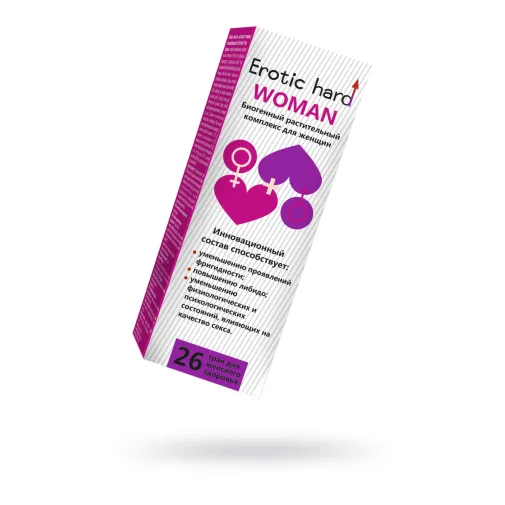 Биогенный концентрат «Erotic hard» WOMAN, возбуждающее средство растительного происхождения для женщин. Состав разработан российскими учеными. Это уникальное сочетание современной науки и народных рецептов оздоровления. Помимо возбуждения и повышения сексуальной активности, достижение которой происходит за счет увеличения кровообращения в области органов малого таза, половые органы и грудь становятся крайне чувствительными, набухшими, прикосновения к ним вызывают повышенную реакцию, присутствует еще и оздоравливающий эффет