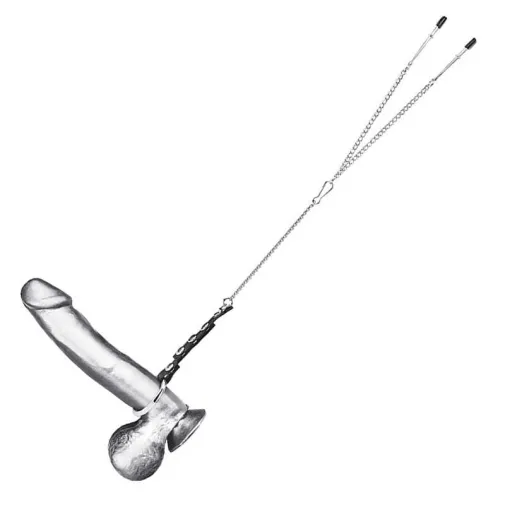 Аксессуар для любителей изысканных, пикантных удовольствий. Игрушка представляет собой металлическое кольцо, одеваемое на пенис, диаметром 4,5 см. и два зажима для сосков. Элементы соединяются при помощи тонкой металлической цепочки. Крепление к кольцу осуществляется при помощи специального ремешка из экокожи с клепками, позволяющими регулировать длину цепи. Длина соединительной цепочки от кольца до кончиков зажимов составляет 52 см. Кончики зажимов имеют мягкое, эластичное покрытие предотвращающее травмирование поверхности кожи.