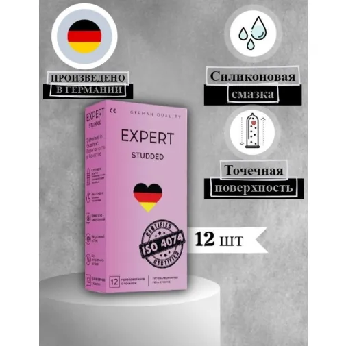 Studded - Презервативы со специальным контуром предотвращающим соскальзывание, текстурированная поверхность позволяет получить максимум наслаждения. Произведены в Германии на заводе Amor под торговой маркой EXPERT. Гарантированное Немецкое качество. Expert - немецкие презервативы высочайшего качества с сертификацией мирового стандарта. В составе используются только натуральные, гипоалKергенные компоненты, помогающие достичь максимального удовольствия и комфорта. Основа изделия - очищенный латекс, изготовленный из природного каучука. Удвоенный слой смазки увеличивает продолжительность действия. Идеально подстраивается под индивидуальные формы обладателя. Каждый презерватив проходит электронное тестирование по европейским стандартам качества. Идеальная поверхность способствует передаче тепла, как если бы презерватива вообще не было, и позволяет чувствовать максимальную близость партнера. Презервативы EXPERT практически неощутимы и являются одними из самых надежных в мире.